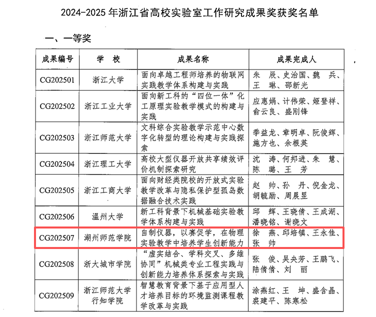 近日,2024-2025年浙江省高校实验室工作研究成果奖获奖名单正式公布。我校理学院徐燕老师主持完成的《自制仪器,以赛促学,在物理实验教学中培养学生创新能力》成果荣获一等奖。本次评选全省共有一等奖9项,我校位列其中,体现了学校在实验教学改革与创新能力培养方面的扎实成效。